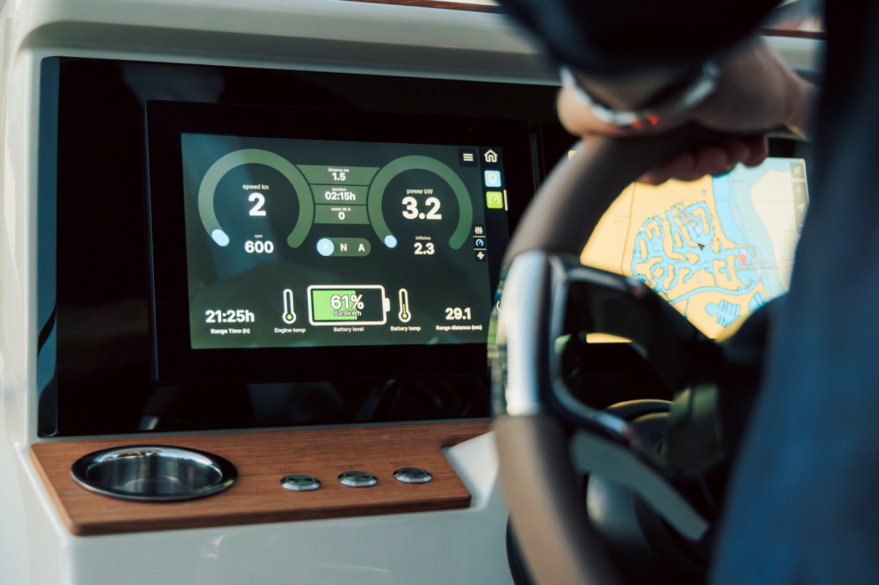 A beépített 126 kWh-s Kreisel lítium-ion akkumulátor egyenletes és hosszan tartó teljesítményt biztosít. 25 csomós (46 km/h) utazósebességnél a hajó kb. 25 tengeri mérföldet (≈46 km) képes megtenni egyetlen töltéssel. A gyorstöltésnek köszönhetően DC töltővel akár 50–60 perc alatt 80%-os kapacitás is elérhető, míg háromfázisú AC töltéssel (3×32 A)a teljes töltés körülbelül 7,5 órát vesz igénybe.