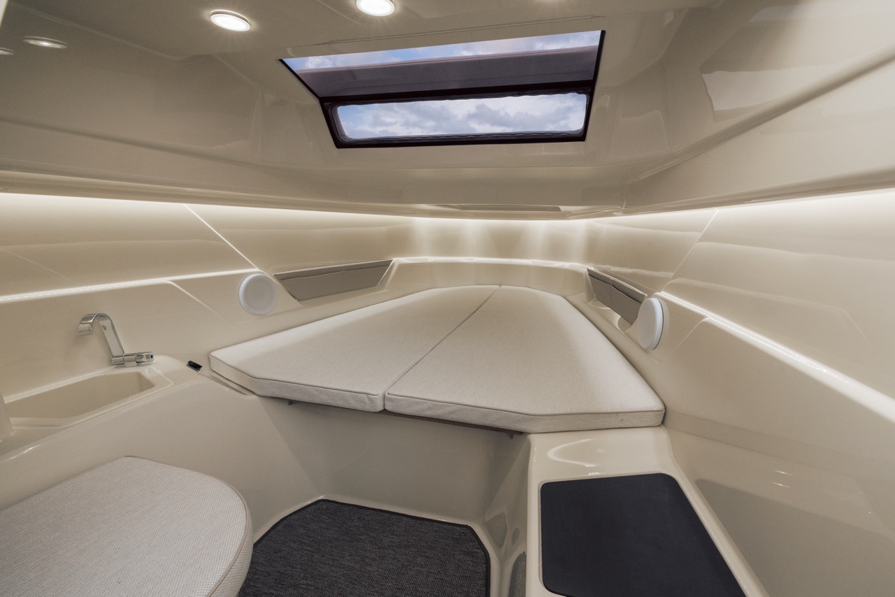 A fedélzet alatt mediterrán hangulatú kabin várja az utasokat, amely két fő részére biztosít kényelmes elvonulást. A beépített édesvízes mosdó, valamint a tengeri WC még komfortosabbá teszi a hosszabb túrákat vagy hétvégi kikapcsolódást. A hajó kialakítása prémium anyagokból, újrahasznosított elemek felhasználásával készült, így az elegancia és a környezettudatosság kéz a kézben jár.