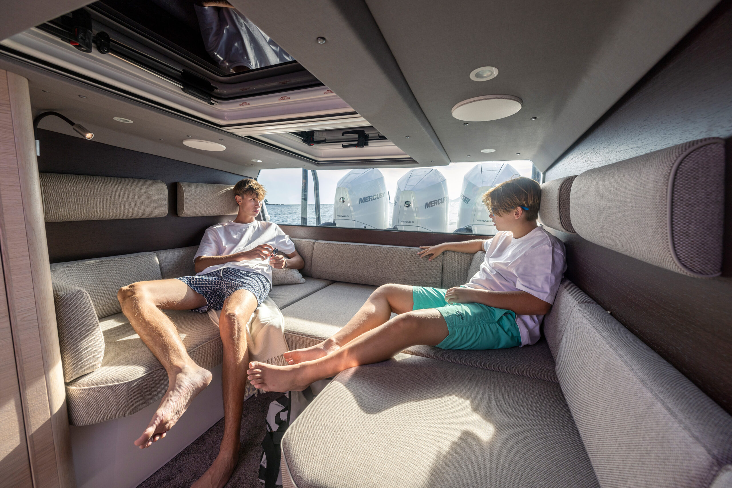 A 45‑ös sorozat alapfelszereltségében a sirályszárnyas ajtók megnyitják a tágas első kabint a külvilág felé.