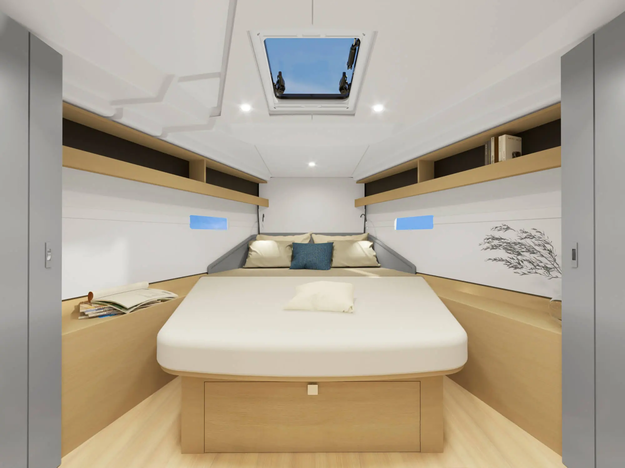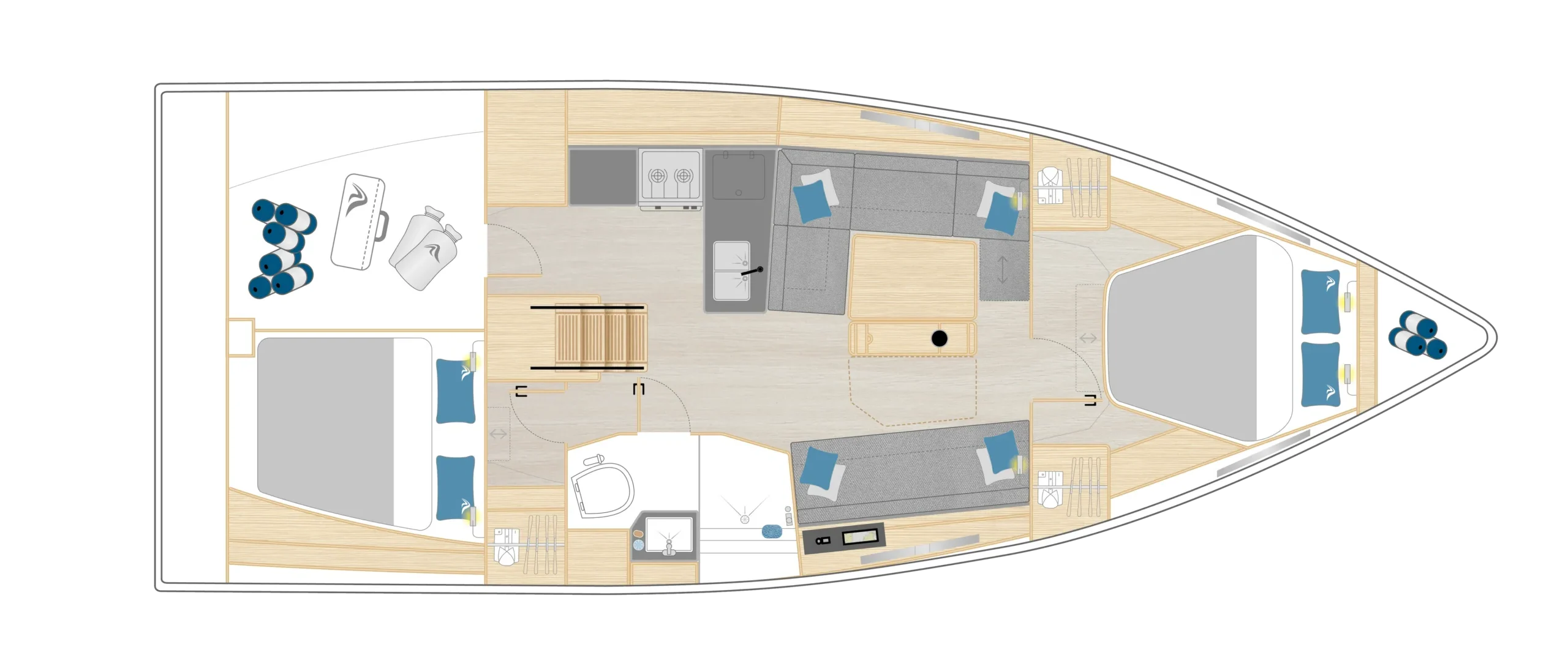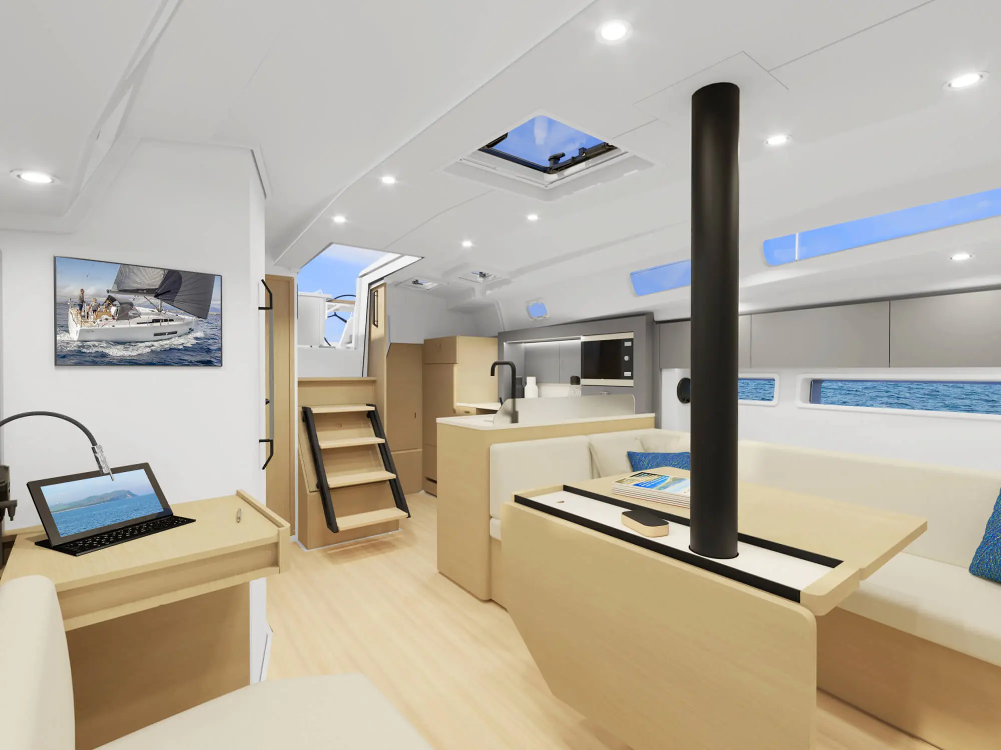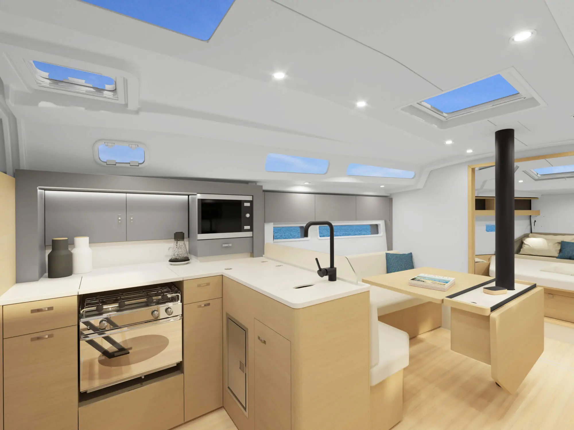 A salon‑cockpit átjárható, részben nyitott‑részben védett: amikor kell, bezárható, amikor lehet, szabadon élvezhető a tenger. Minden funkció (vitorlavezérlés, motor, navigáció) logikusan pozícionált a kormányállásból.