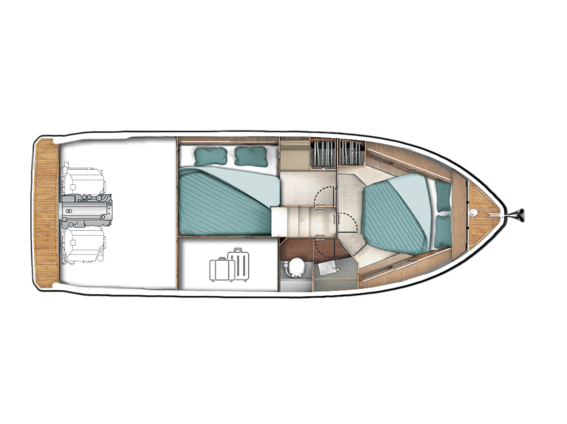1 x Volvo Penta D6-340A SEALINE C335 fedélzetén egyik lenyűgöző pillanat követi a másikat. A sportos, intenzív vezetési élményt a 540 lóerős motorteljesítmény, az újragondolt, áttekinthető műszerfal és a kormányállásból nyíló kiváló körpanoráma biztosítja. A tulajdonosi kabinban is minden irányból természetes fény árad be. A prémium szövetek és a nemes faanyagok páratlanul luxus hangulatot teremtenek.